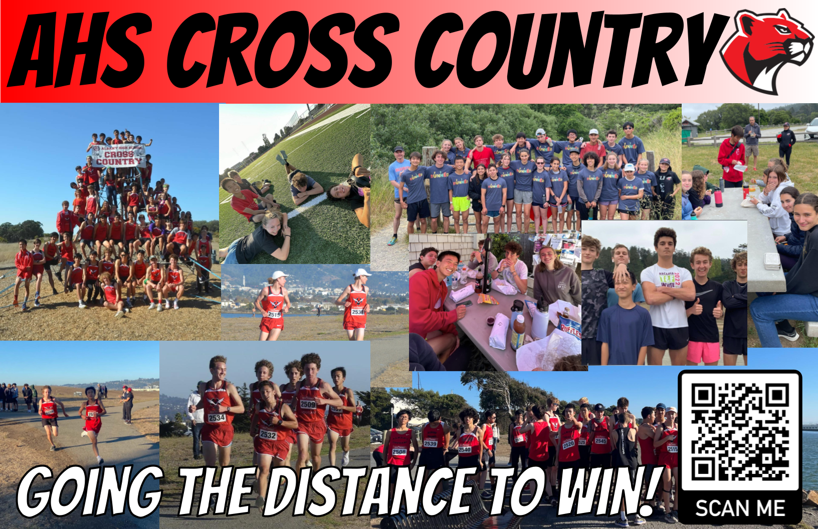 PROFILE/DESCRIPTIONMy goal was to create a graphic design project that showcases the Albany High School Cross Country team and our community. The design serves to be eye-catching and conveys the team’s spirit and determination and includes many group photos or action photos of races. There is also a semi call to action with the “Scan Me!” QR code, which will (supposedly) direct viewers to our meet schedule, how to join, and practice times and dates. It currently only directs to my Strava