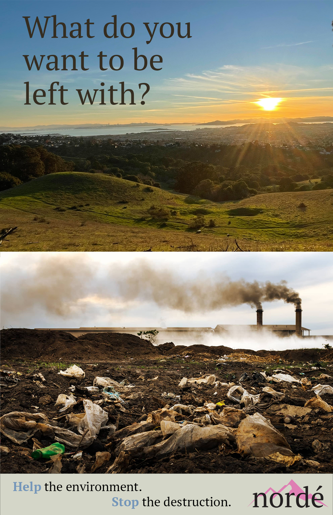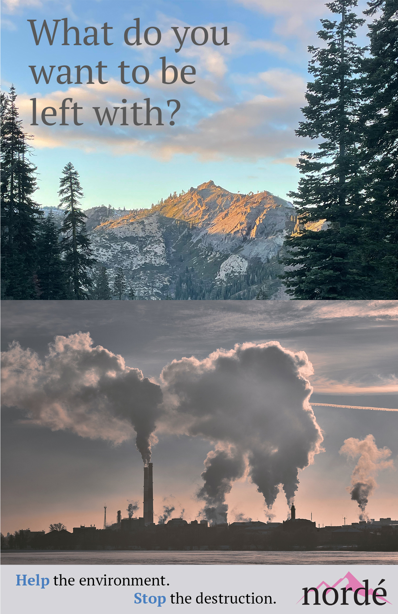 My company is called Nordé and is located in El Cerrito. We are pretty big with a reach throughout the entire United States. Nordé is a non-profit company that works to inspire people to be in nature. We target cities like LA because of how developed it is and the lack of pure nature there. We put up ads that inspire people to help nature. When somebody sees our posters, they should become more aware of whats happening to the environment. We are trying to create a call to action to help the environment. So much destruction is happening for the purpose of development, massive ecosystems are being destroyed and most people don't know, as well as less oxygen being put into the atmosphere.