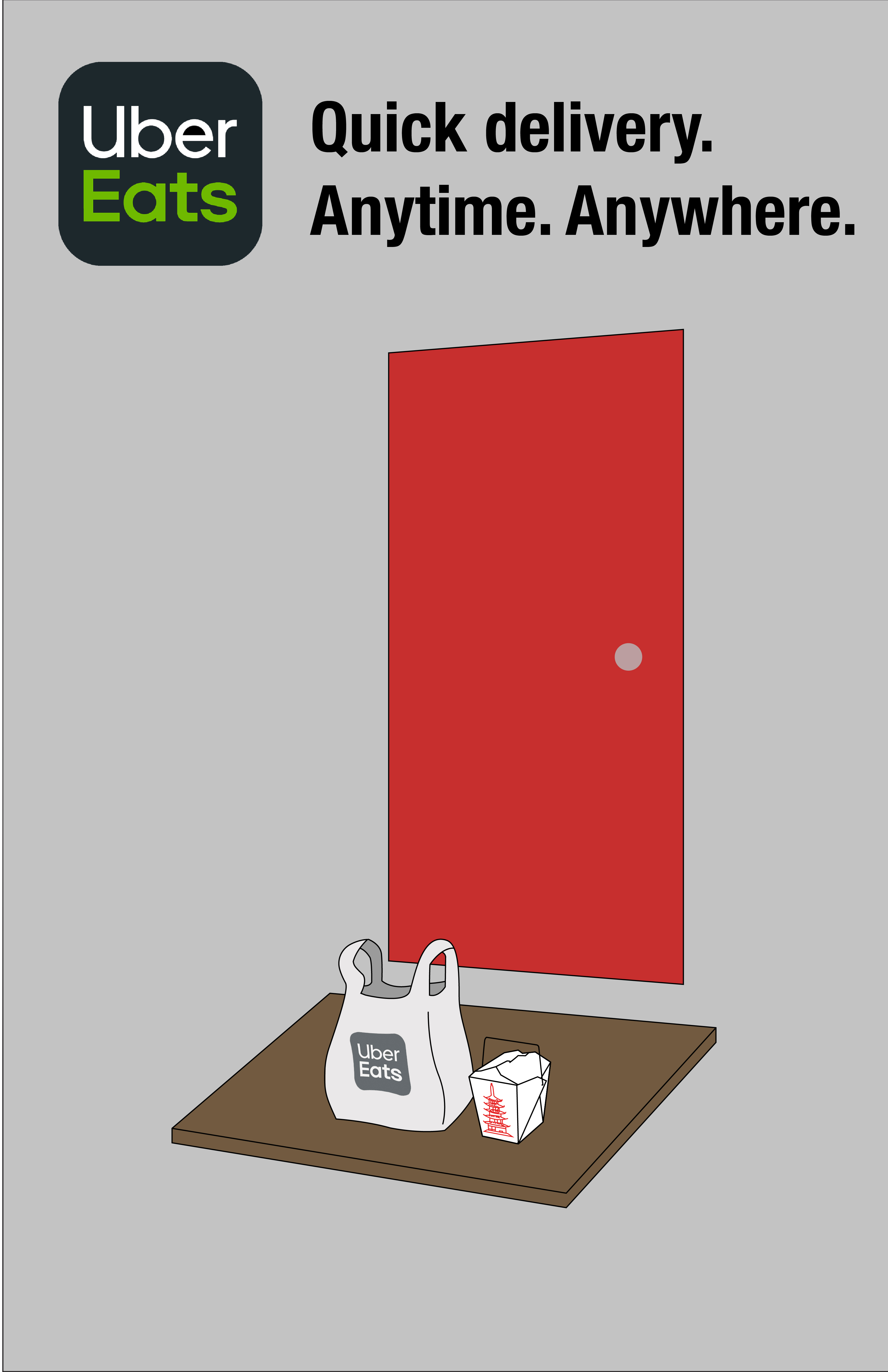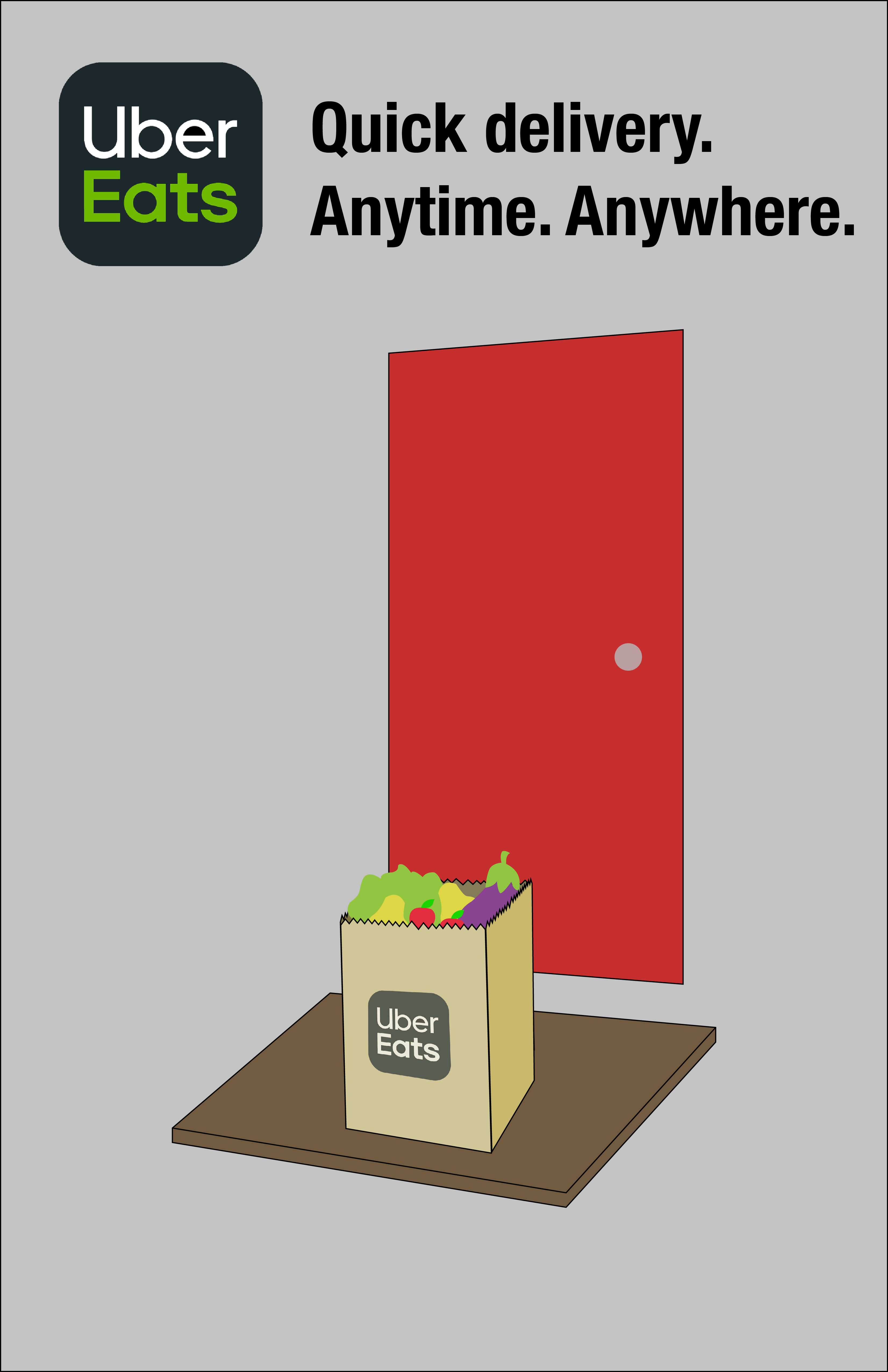 The goal for my Ad is to make people want to order UberEats, by reminding them that they can get it ordered to them wherever they are. To accomplish this I will make a subheading for the Ad with the slogan “Food. Anytime. Anywhere.” I will also be advertising the different reasons one might use UberEats.One of the posters will be two people eating a restaurant meal, what people usually imagine when they think of UberEats. One of the posters will show groceries being delivered to a door, and one of the posters will show an UberEats cupholder with some boba, showing that you can order something as simple as drinks on UberEats.