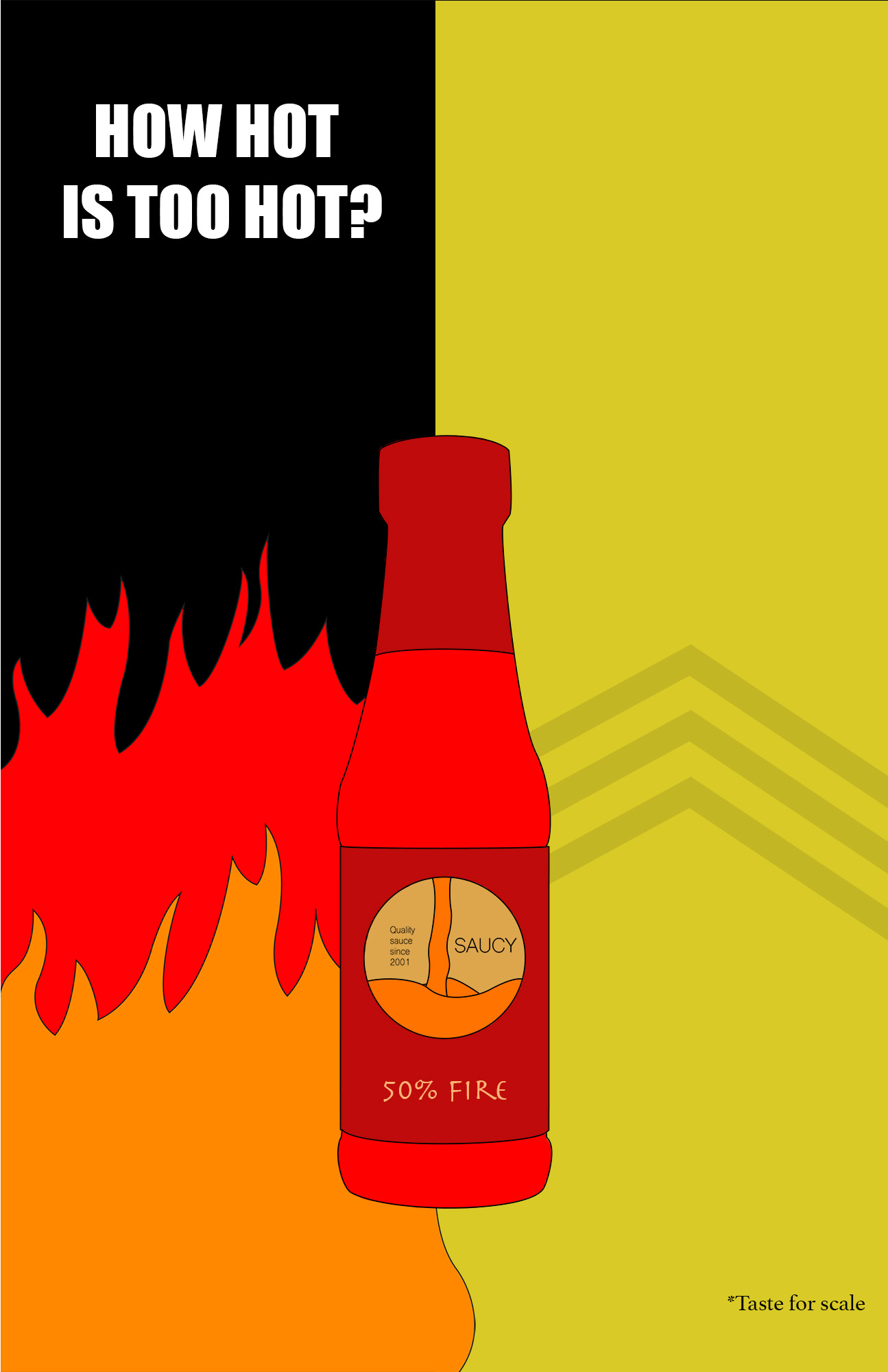 Goals: We are doing a promotion for our newest line of sauces, “Blaze”. When people see our posters, we want them to think that our sauce is incredibly spicy, but also still manageable for the average person if they choose the least spicy version. There will be 3 different levels, with 3 different types of posters to go along with them. The poster will have a fire wall behind a bottle of our product, and how high the fire wall goes will represent how spicy it is. At the top, there will be bold text saying “How much heat can you handle?”.