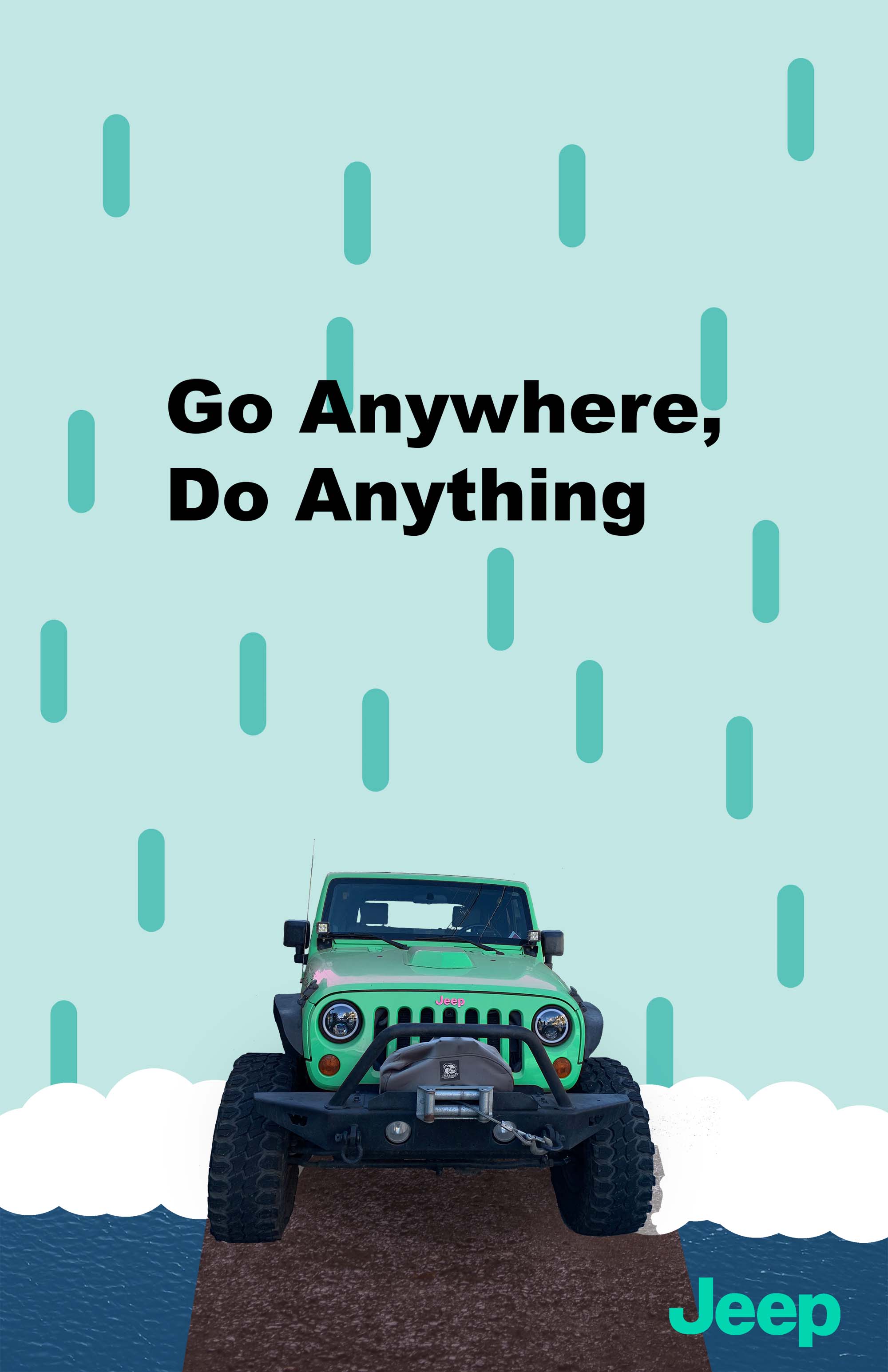 After seeing the poster, I want people to know they have the option to own a vehicle that will drive in any terrain knowing their vehicle was specifically engineered for this purpose, providing reliability. I want them to know that if they bought this vehicle, they would have no limitations from the terrain giving them a sense of freedom and adventure. I want people to visit the Jeep website, or a nearby facility if they are in search of a new vehicle and know that Jeep is a competitive option to become their new car.