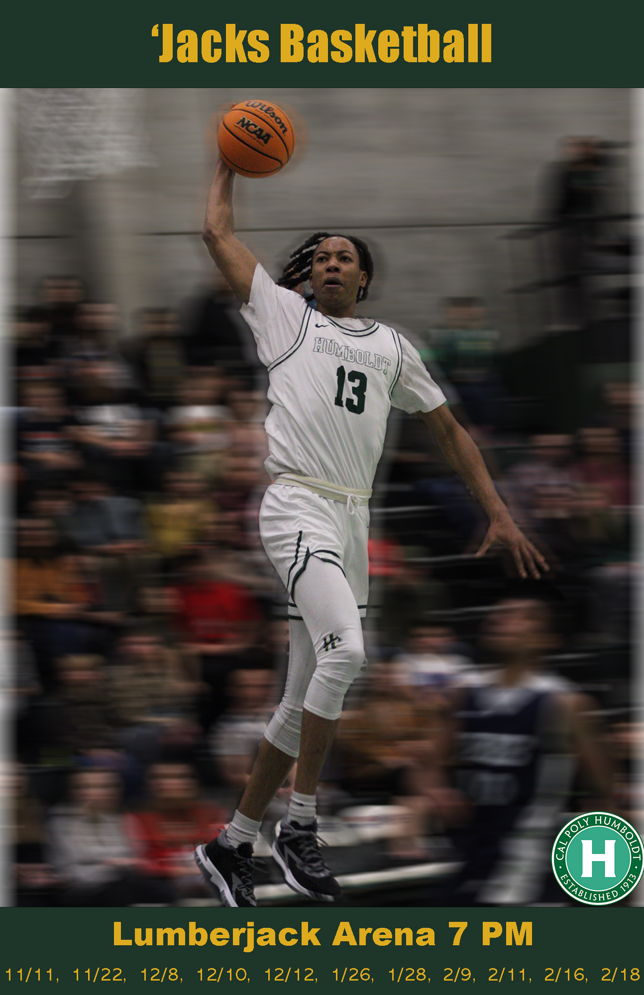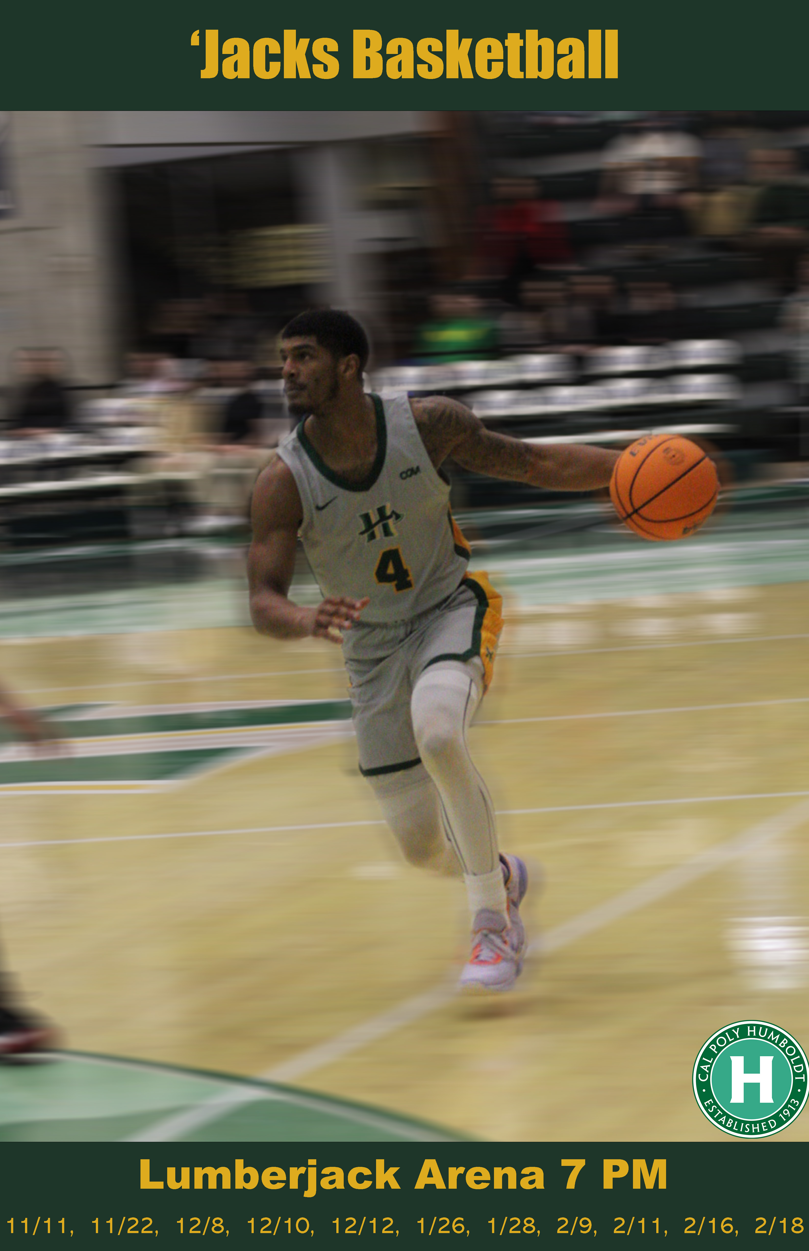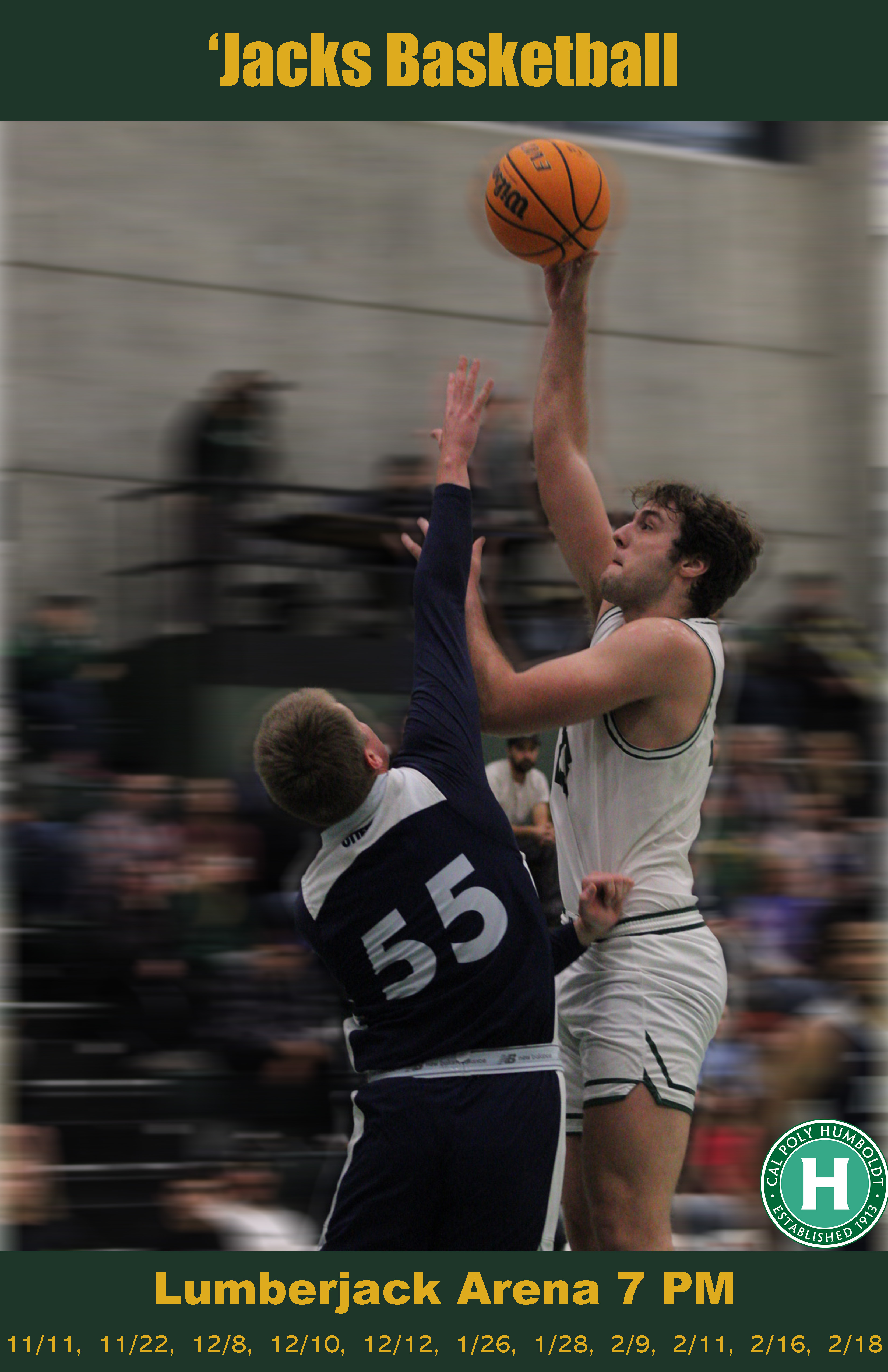 PROFILE/DESCRIPTIONCal Poly Humboldt Lumberjack Athletics is the company. They are located on the northern California coast and are a Division II school and their mascot is the lumberjack. At Humboldt there are 12 different sports teams: men's basketball, men's track, men's cross country, mens soccer, women's basketball, women's cross country, women's rowing, women's soccer, women's softball, women's track and field, women's triathlon, and women's volleyball. These posters are advertising for men's basketball games, designed to build excitement about its star players and increase home game attendance amongst Alumni and young people living in the area.