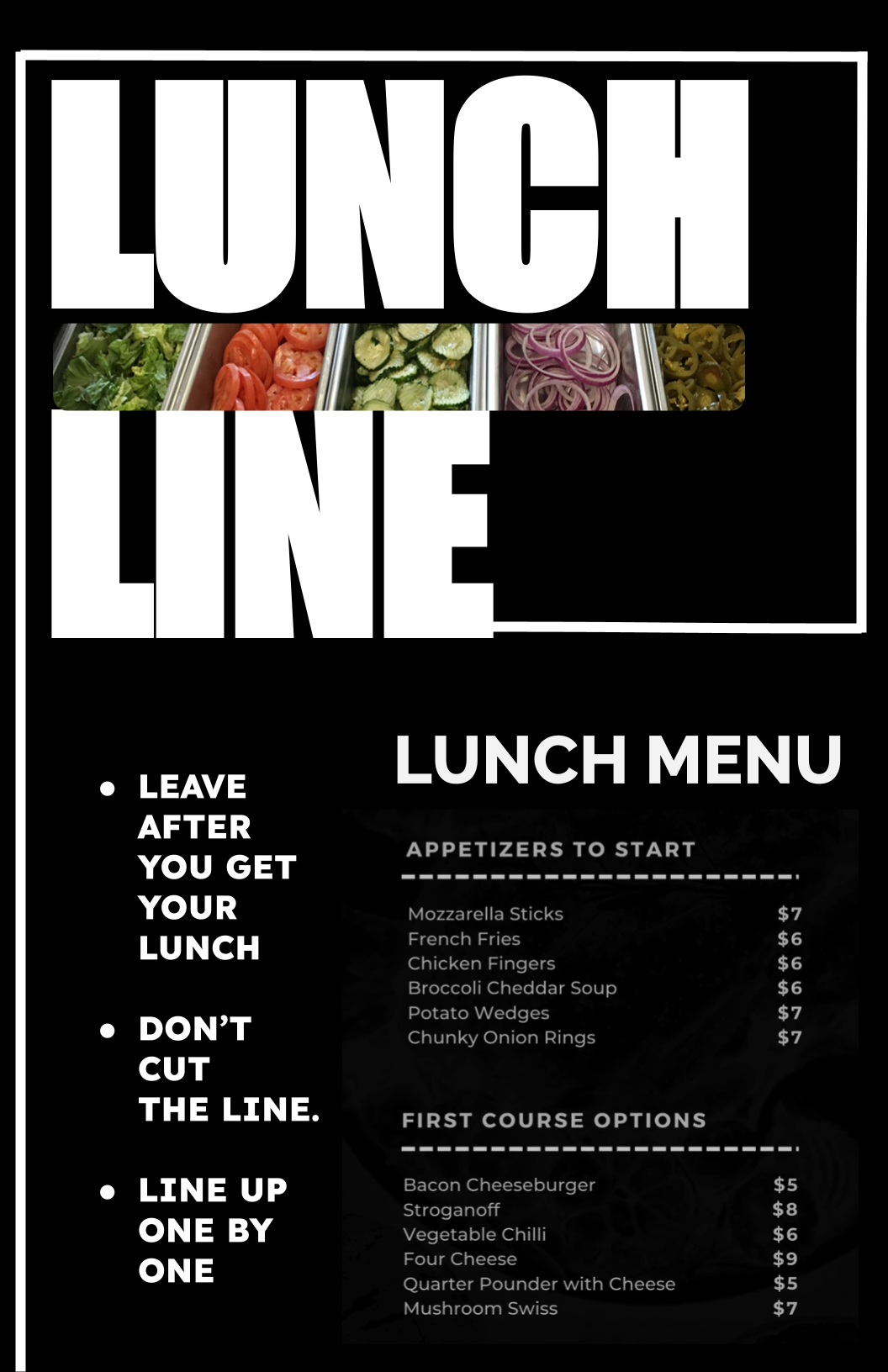 PROFILE/DESCRIPTIONLunch line was so crowded and unorganized, so I made this design. And also, lunch menu in the screen was to far away from lunch line, so I think add lunch menu on the poster might be a good idea, then people can see the menu while they waiting in line.
