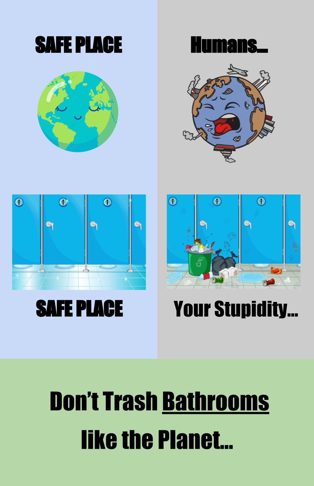 The BOYS bathrooms at Albany High School are constantly trashed. No mirrors, no dividers, and no locks are almost the least of your issues. Ceiling tiles and wet paper towels litter the floor and in general the bathrooms are in quite the disarray. We have made a poster to put outside the bathrooms in hopes of guilt tripping people into being more conscientious of the people around them.